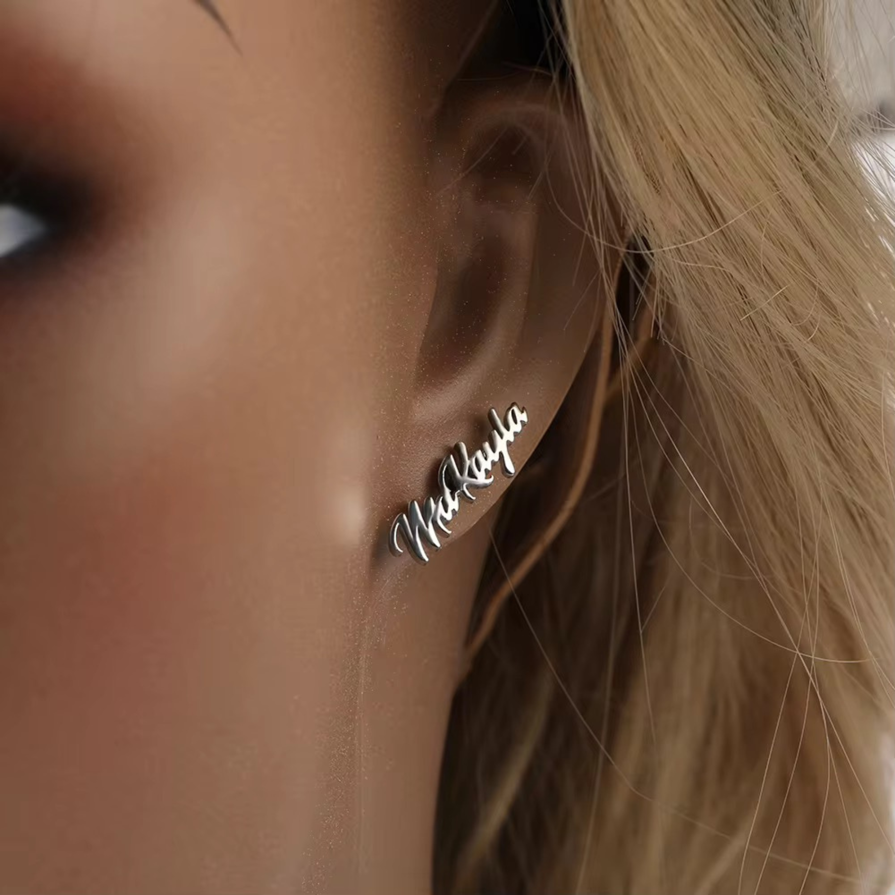 Small in size but big on style, these stud earrings are the perfect way to wear your name (or any word you choose) with confidence. Designed in a sleek script font, they sit comfortably on the ear while making a bold, personalized statement.